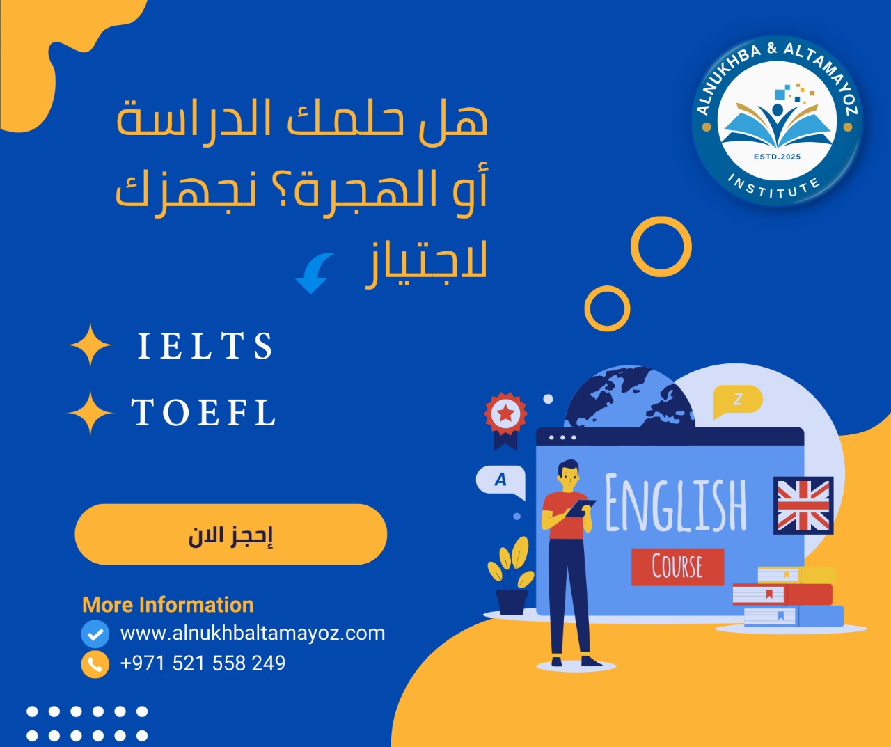 في معهد النخبة والتميز للخدمات التعليمية والتدريب المهني، نُقدّم لك برامج تدريبية متكاملة للتحضير لاختبارات IELTS وTOEFL، تساعدك على تحقيق أعلى الدرجات، بفضل التدريب العملي والمستوى التعليمي المتميز.